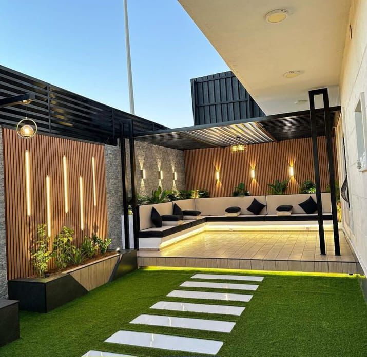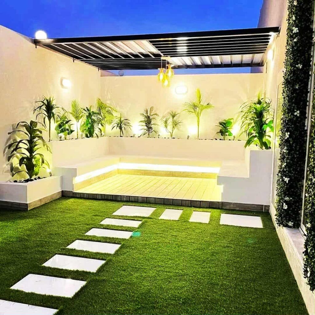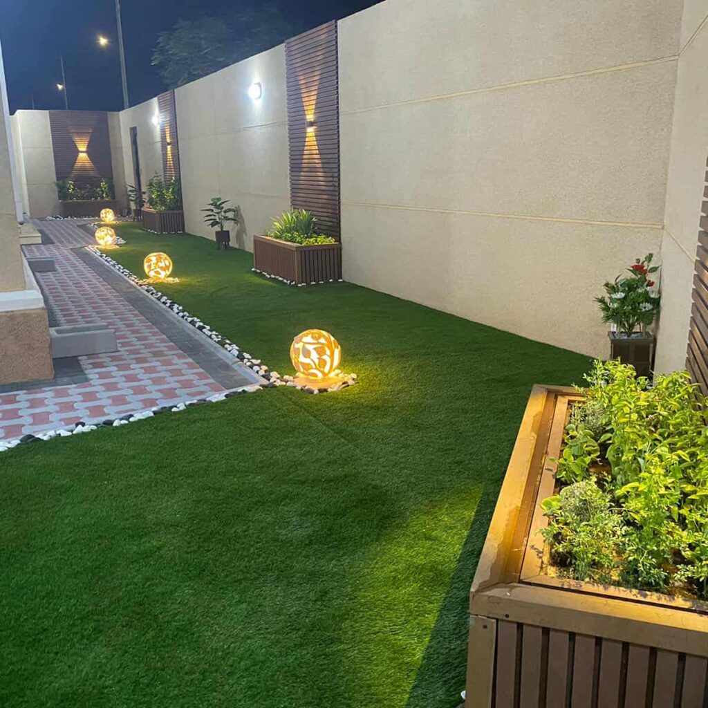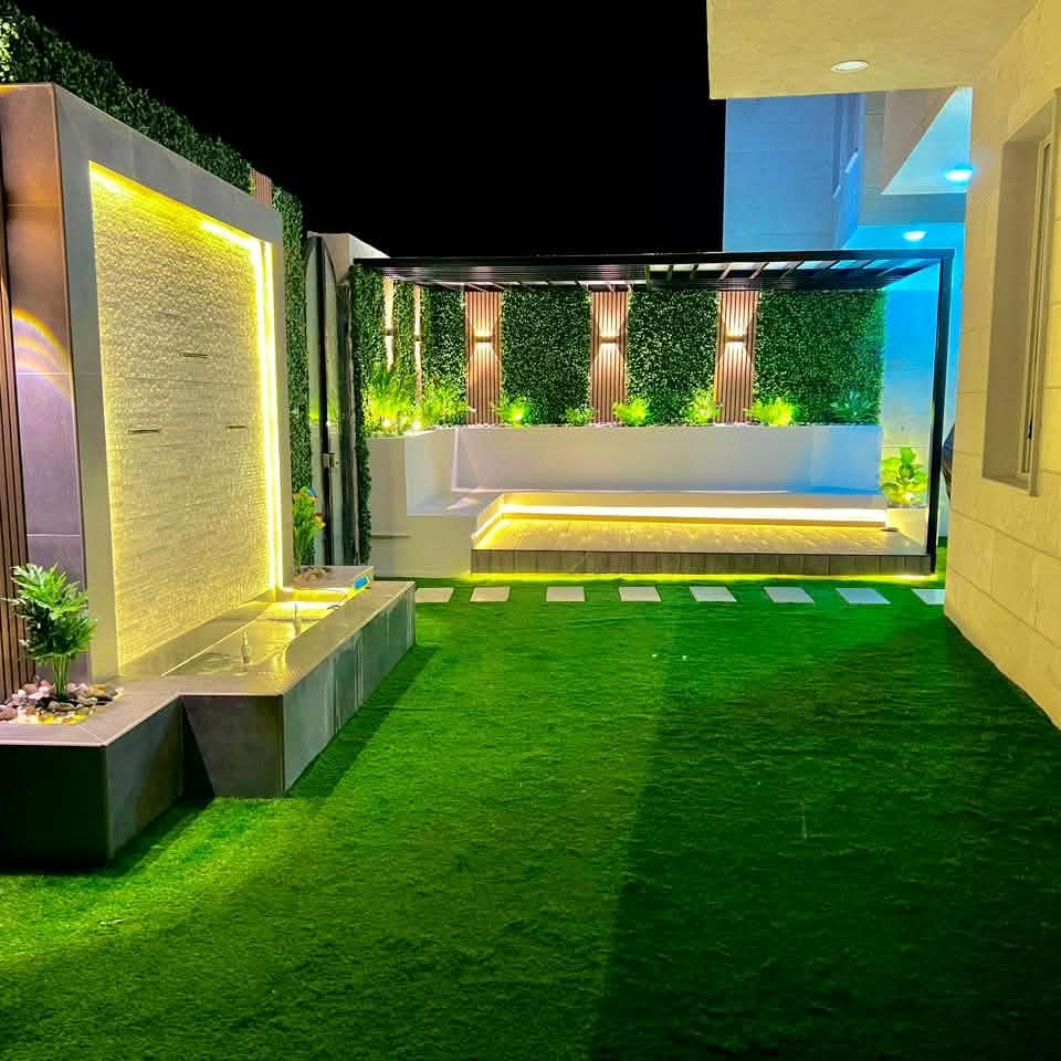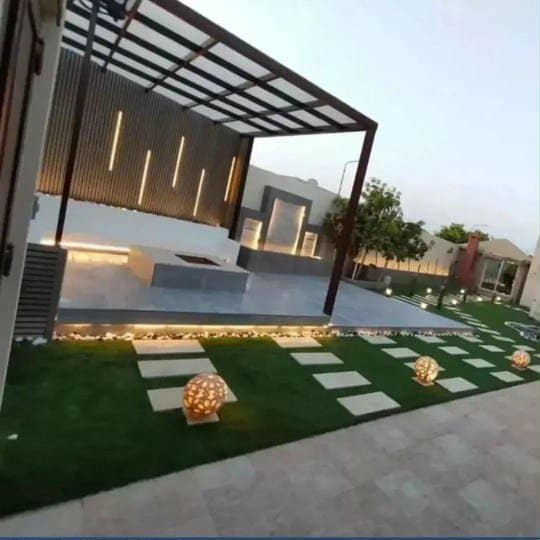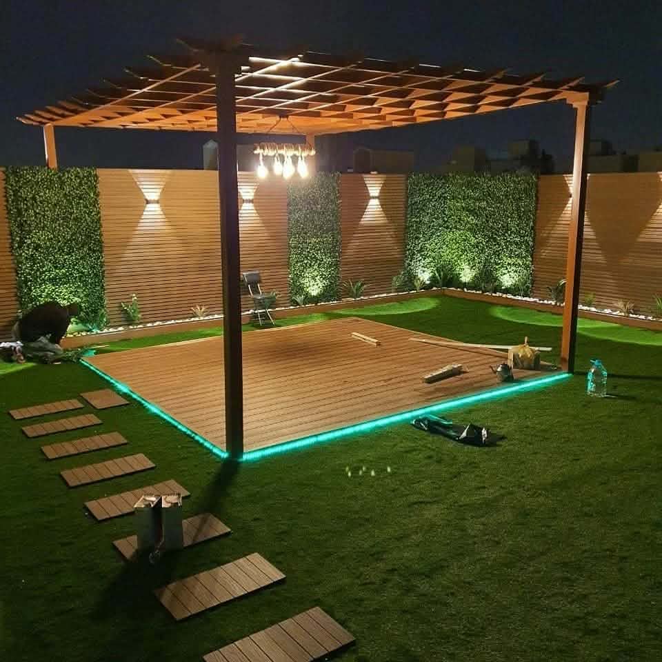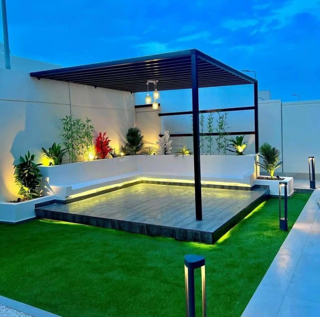 والأضاءات الجميلة الهادئة وعمل اماكن كثيره للضيوف وجميع افراد الاسره للكبير والصغير فالحديقة هامة للغاية وتصميمها هام لكل فرد .