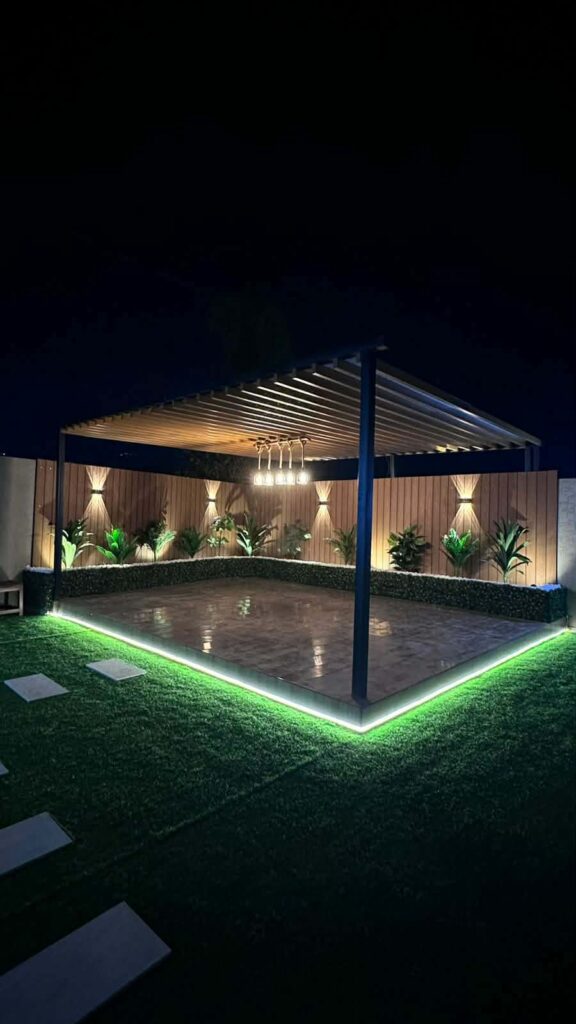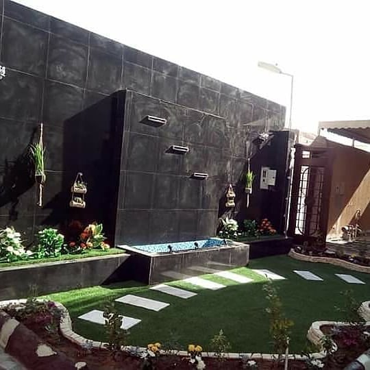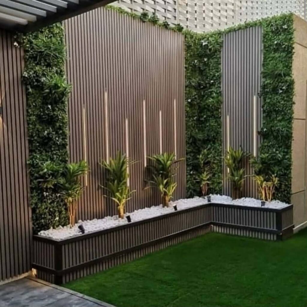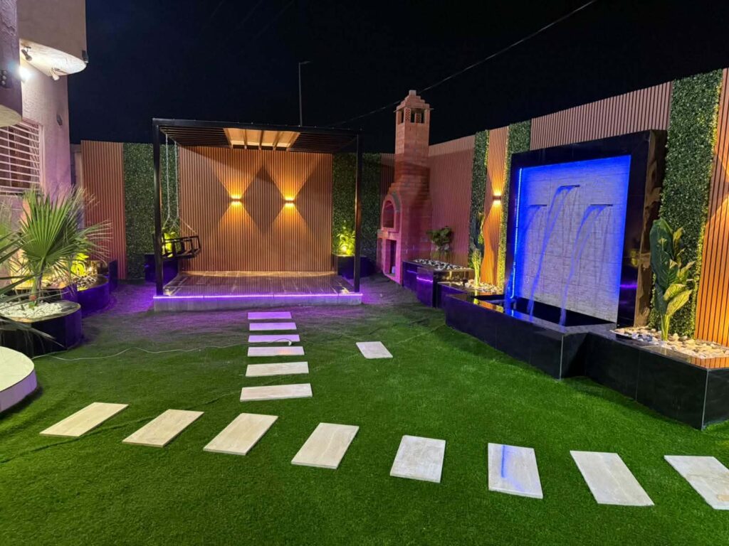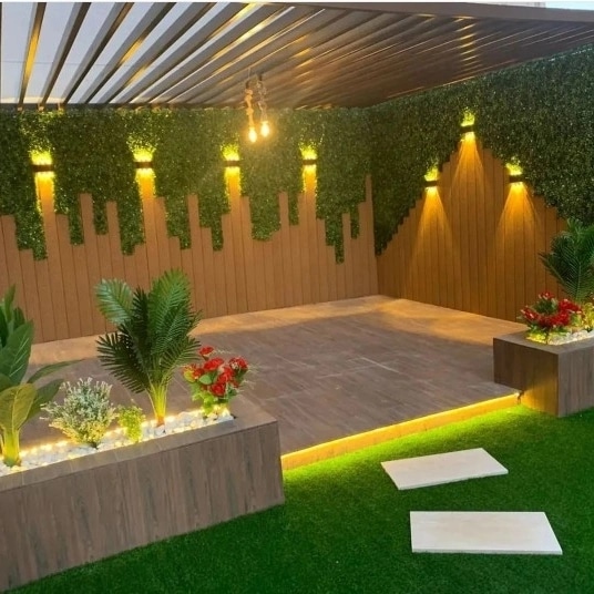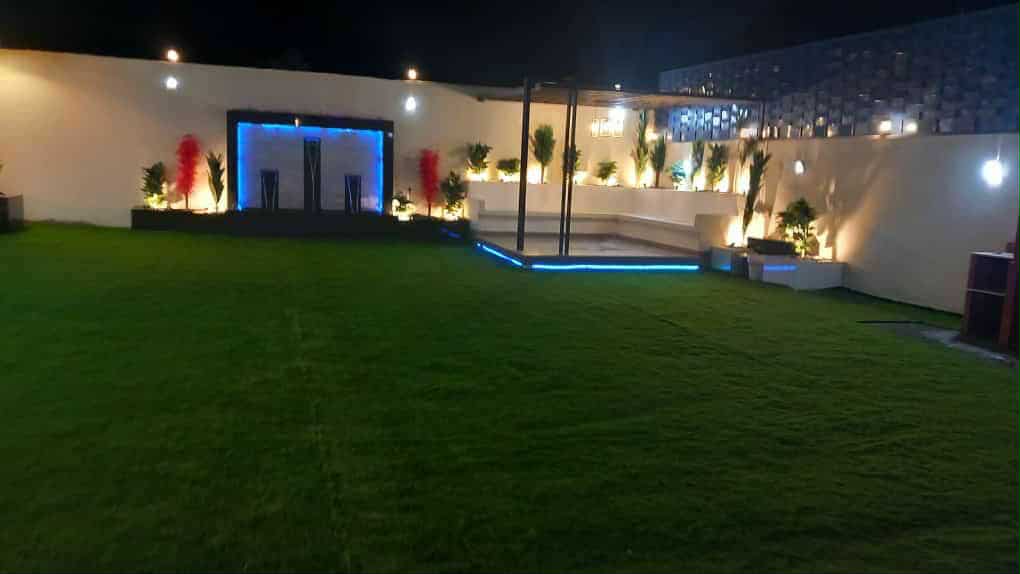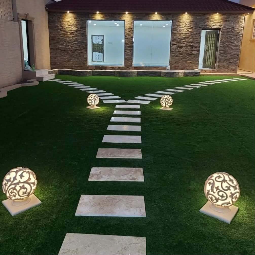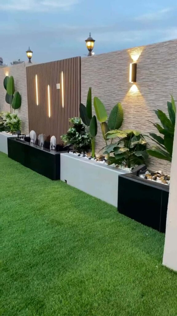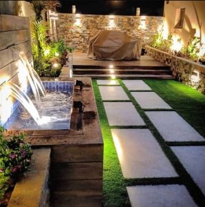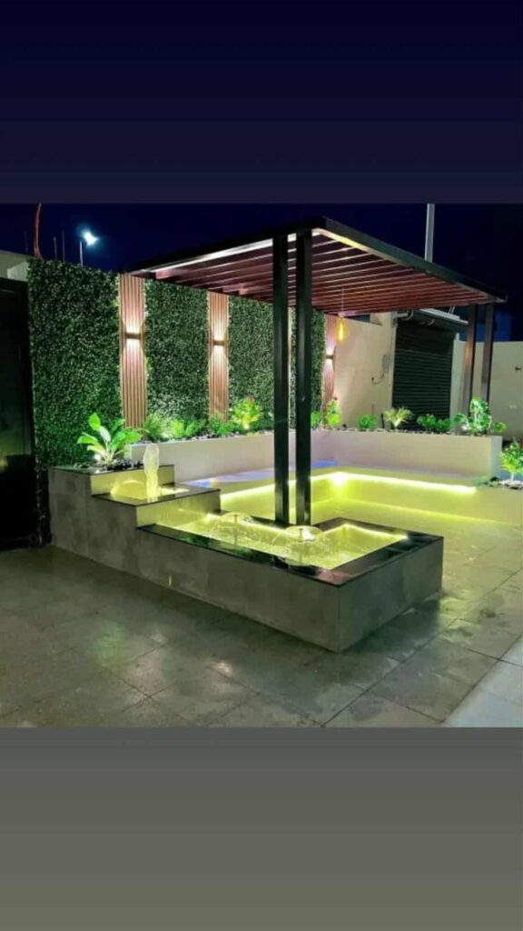 والأضاءات الجميلة الهادئة وعمل اماكن كثيره للضيوف وجميع افراد الاسره للكبير والصغير فالحديقة هامة للغاية وتصميمها هام لكل فرد .