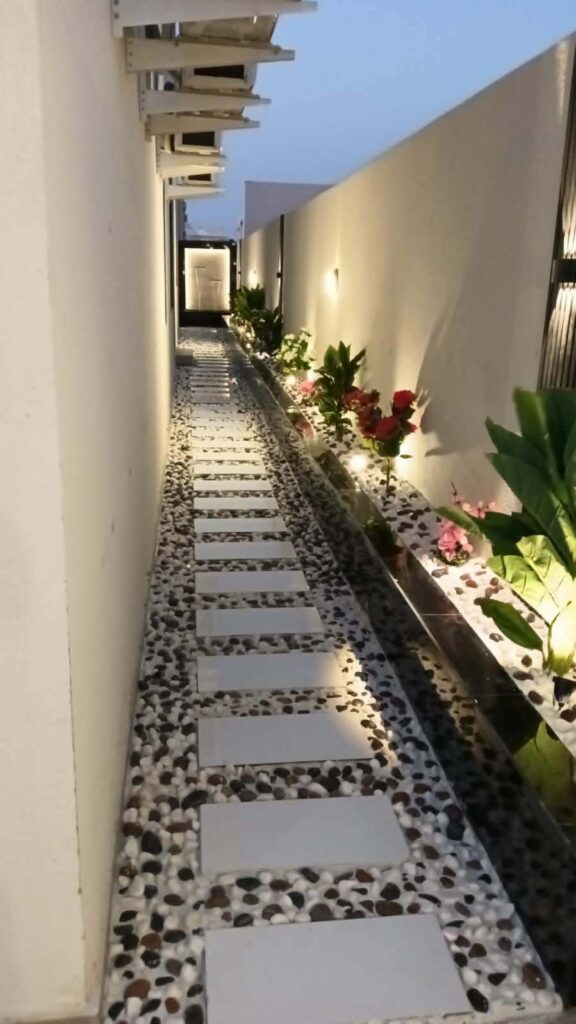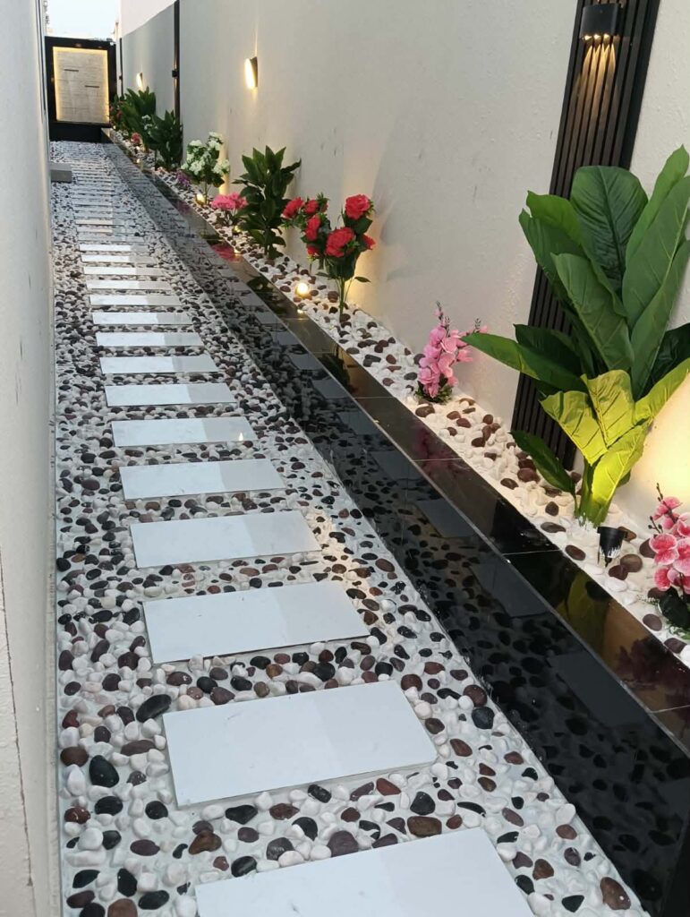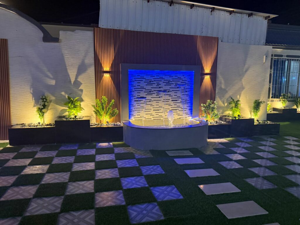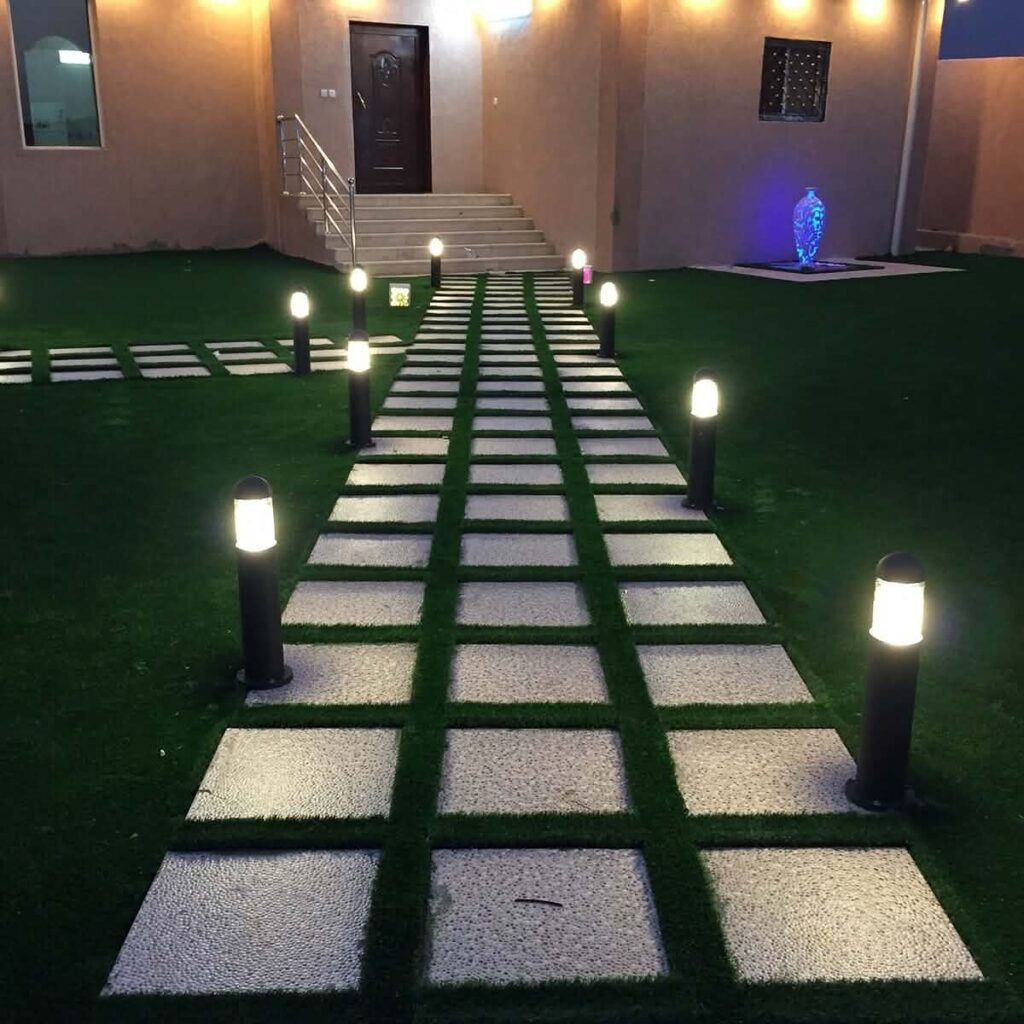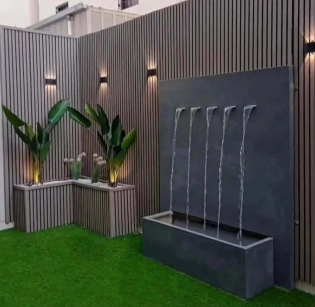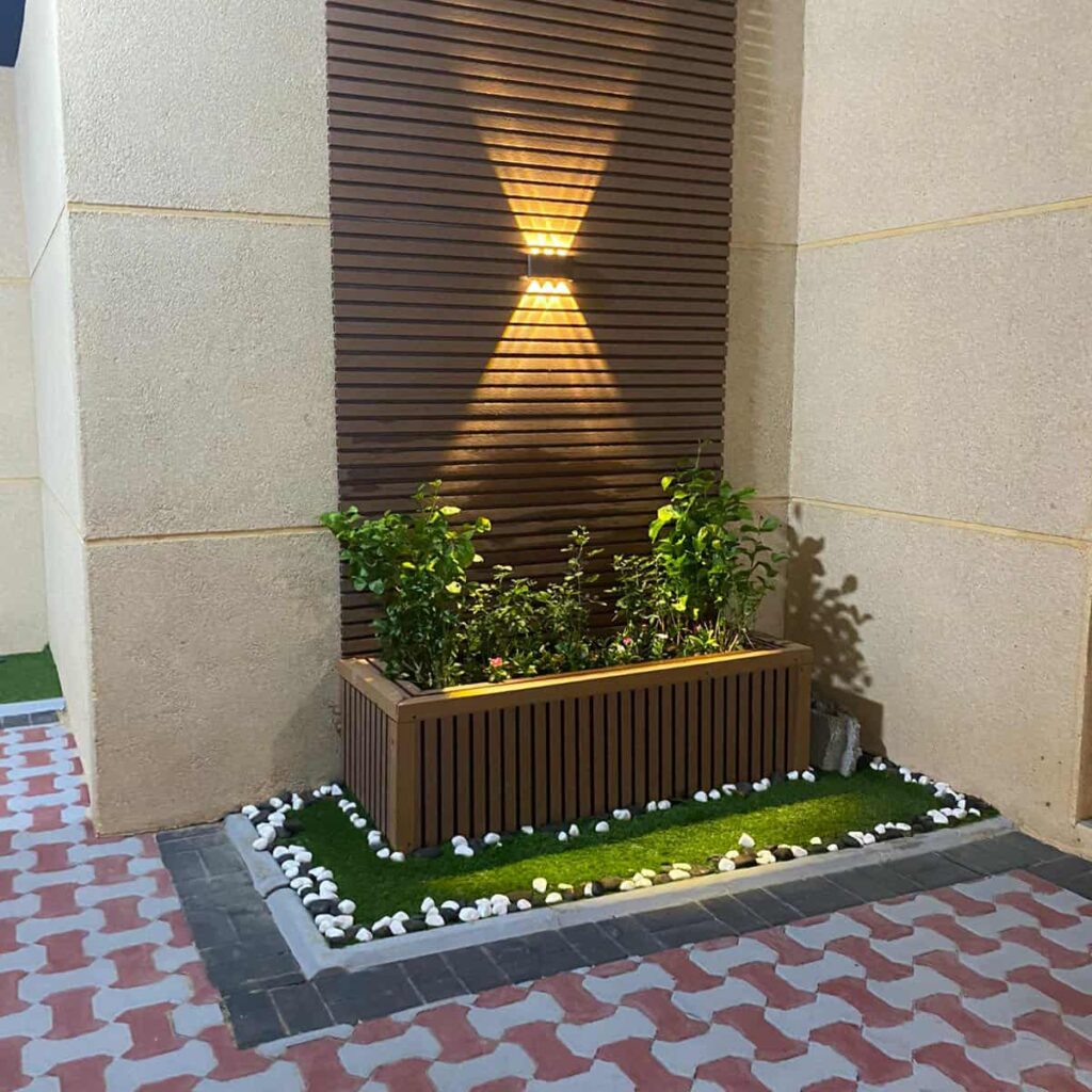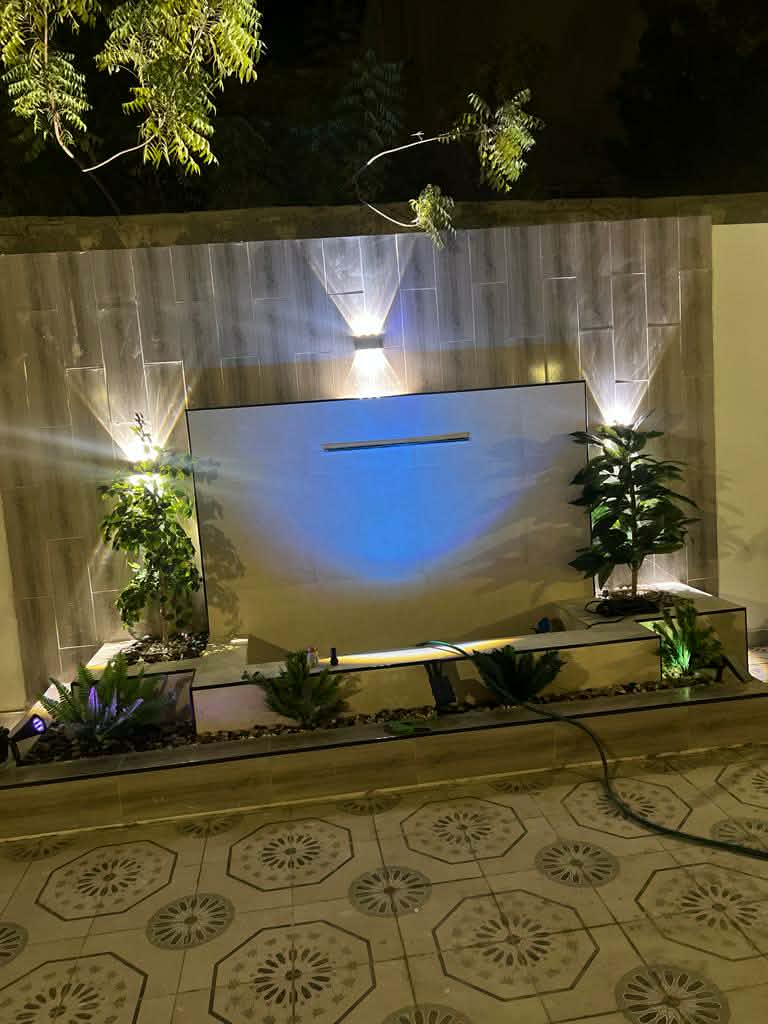 والأضاءات الجميلة الهادئة وعمل اماكن كثيره للضيوف وجميع افراد الاسره للكبير والصغير فالحديقة هامة للغاية وتصميمها هام لكل فرد .