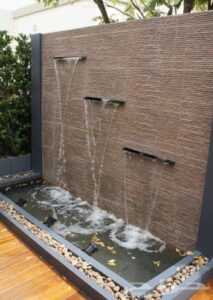 - الشلالات الجدارية تعتمد هذه الشلالات على جدار مائي يتدفق منه الماء بشكل عمودي أو مائل مما يوفر تأثيرًا جماليًا جذابًا، يمكن دمج هذه الشلالات مع الإضاءة لتزيد من جمال المشهد في المساء.